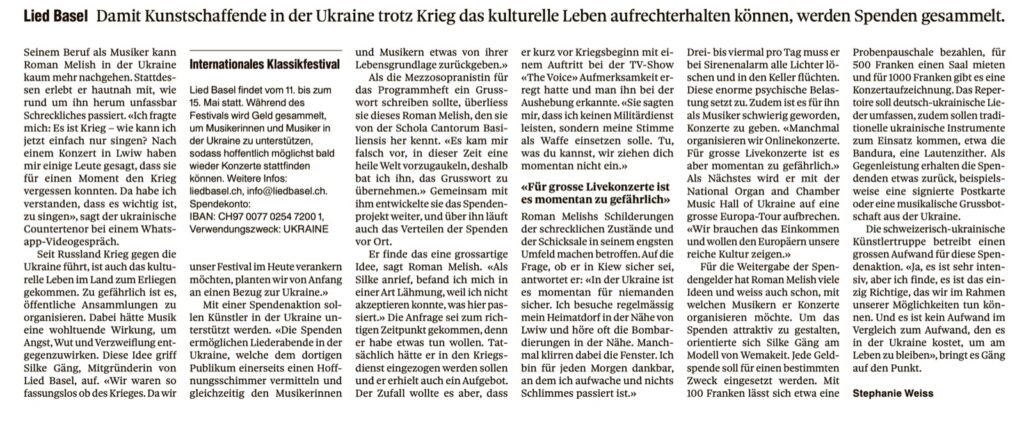 „Credo“ zusammen. Sie nahm auch an Festivals wie dem IV. Internationalen Festival für Kirchenmusik in Rottenburg (Deutschland), dem Polyfollia-Festival in Saint-Lo (Frankreich), dem Kyiv-Music-Fest, dem I.